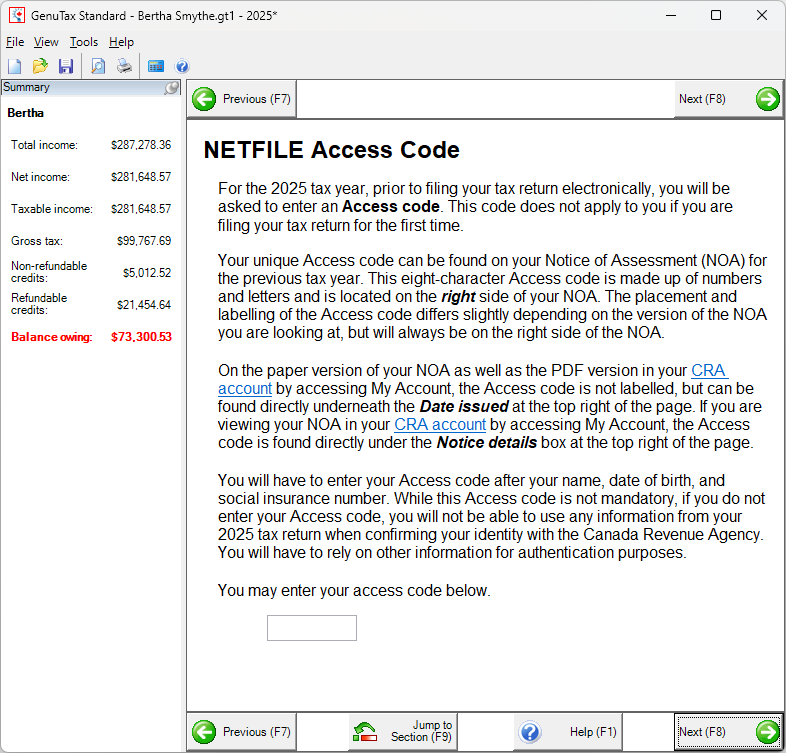 On the next step, if you did not enter your NETFILE Access Code near the beginning of the interview, you are asked to enter it now.