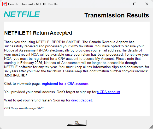 If the Canada Revenue Agency successfully receives your tax return, you should see a message similar to the following, along with a confirmation number.